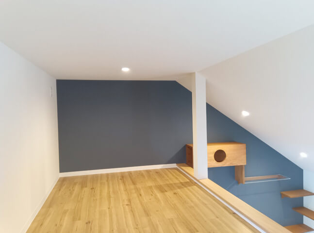 真ん中のお部屋にゃけどちゃんと窓も抜けもあって、ロフトは一番広く、キャットステップには隠れんぼボックスが効いているにゃ