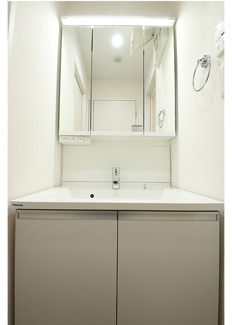 収納力に優れた三面鏡タイプの洗面台を完備。